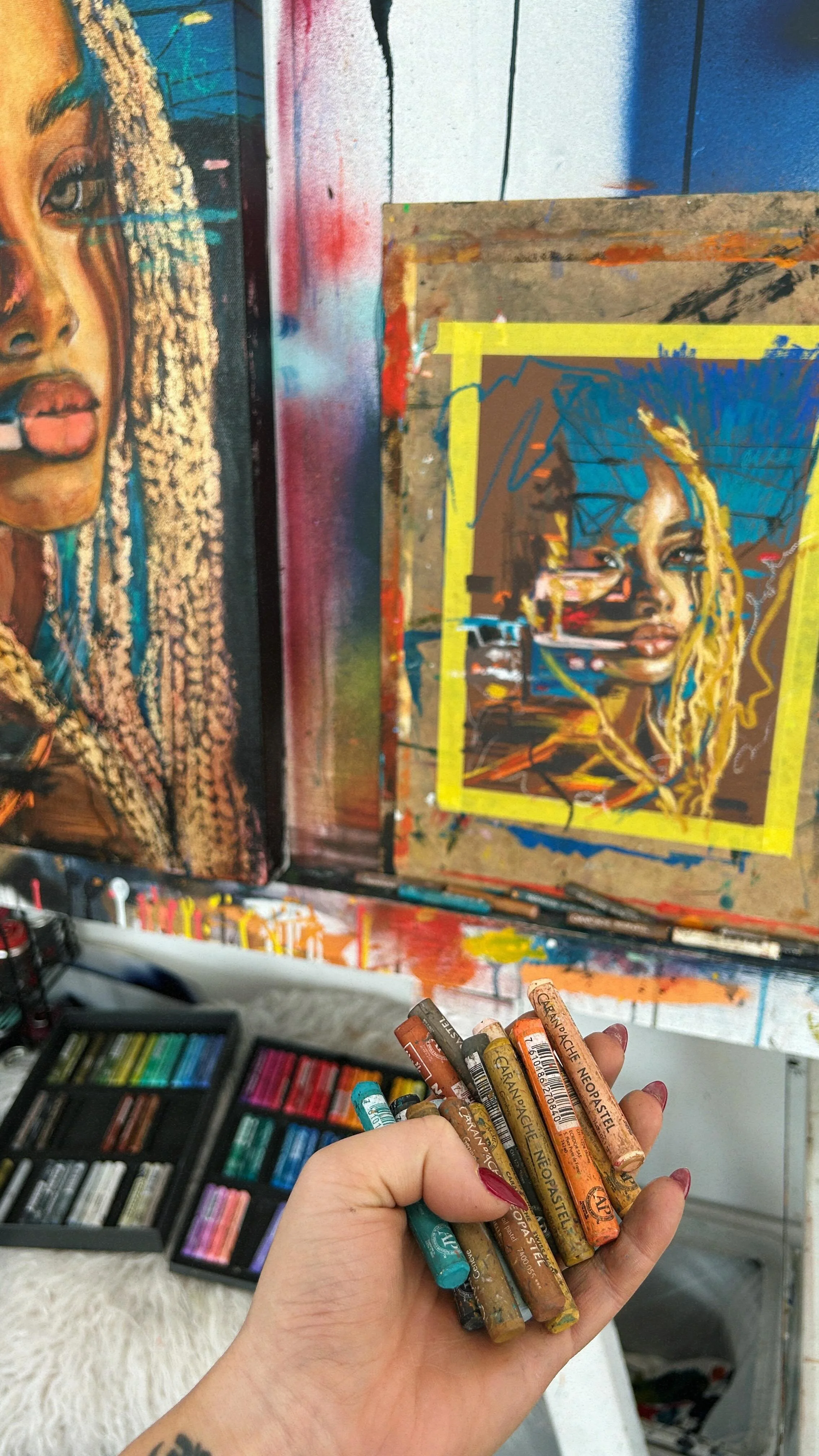 A creative to her core, she creates vibrant, empowering works that explore strength, vulnerability, and self-acceptance.